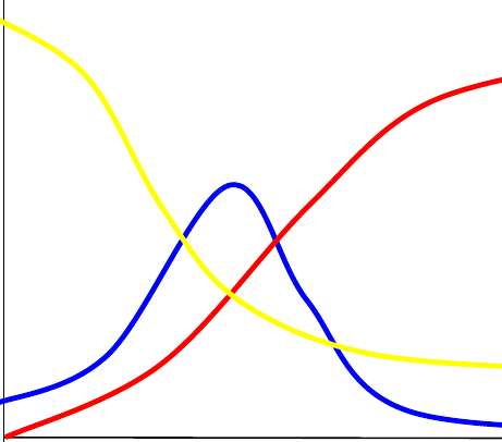 Tenemos entonces una función I(t) que comienza creciendo y luego, a partir del valor t*, empieza a bajar. El siguiente gráfico muestra, de manera esquemática, el comportamiento de las tres funciones: I (azul), S (amarillo), R (rojo).