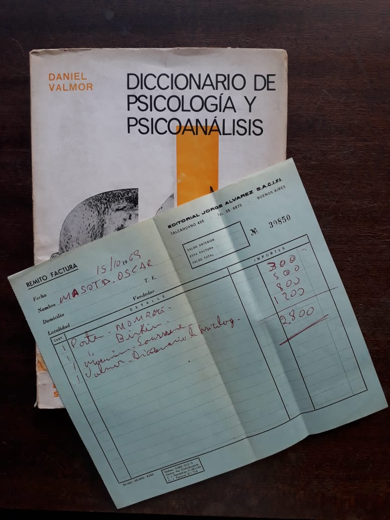 Lo primero que le pregunté fue: ¿Es cierto que en la biblioteca están los libros de O Masotta? No hay ningún registro, me contestó, eso circula como un mito fundacional, pero, en uno de los libros, el Diccionario de Psicología y Psicoanálisis, de Daniel Valmon, encontré el remito, emitido por la Editorial Jorge Álvarez (Talcahuano 485, a la vuelta de la actual sede de la EFA) a nombre de Masotta O. Ese remito es lo que los historiadores llaman documento, el dato duro, la prueba.